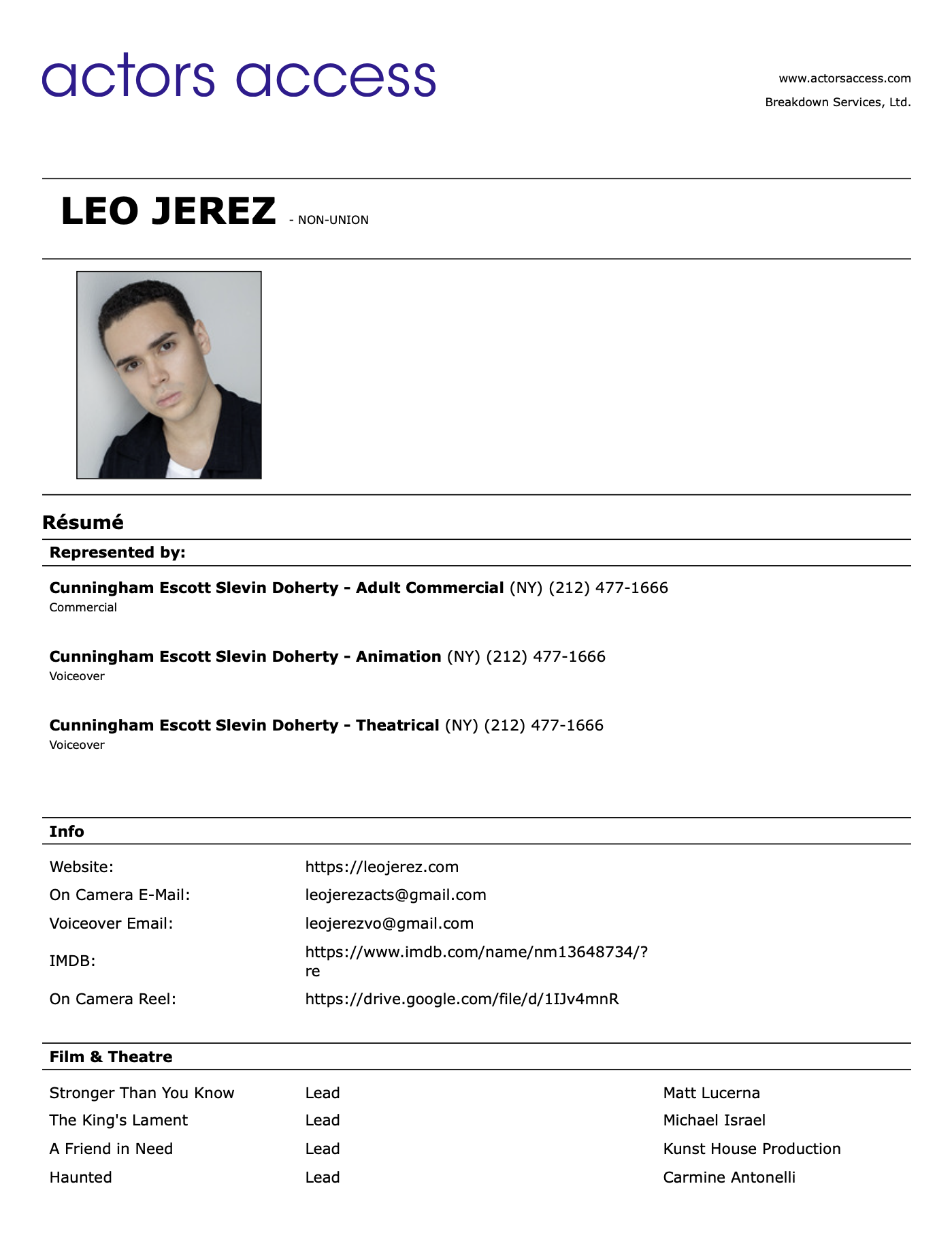 Leandro "Leo" Jerez is an Actor/Voice Actor based in NY and is of Hispanic/Dominican descent. With many years of experience, ever since he was young he's performed on stage for theatre productions and has been in films along with voice acting in many animations, video games, Ad’s & commercial projects.